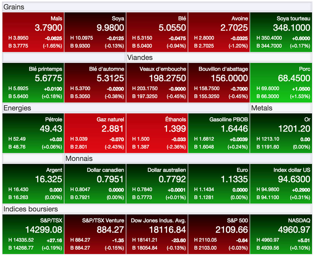 Le marché des grains a ouvert la semaine de mauvais pied, particulièrement celui du maïs. Les nouvelles pour justifier cette faiblesse ne sont pas légion, mais les marchés peinent à trouver des motifs pour également initier un retour à la hausse. Le marché du pétrole a été sous pression aujourd’hui, retournant sous la barre de 50 $US/baril, et contribuant à alourdir le contexte général du marché des commodités, dont celles agricoles.
