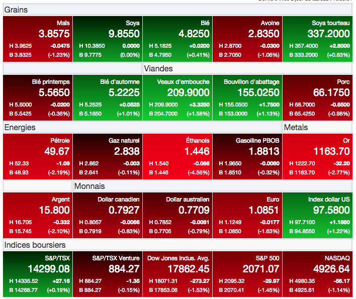 Pour l’instant, il semble que cette fermeté n’ait pas affecté particulièrement le marché du maïs, dont les ventes à l’exportation restent intéressantes. Par contre, les marchés sont beaucoup plus nerveux concernant le sort de ceux du soya et du blé. On sait que le Réal brésilien (devise du Brésil) frise toujours de nouveaux creux, renforçant l’idée que les pays importateurs devraient rapidement se tourner vers cette source d’approvisionnement dans les prochaines semaines ; en fait, dès que les récoltes et les problèmes de logistique de transport seront tout au moins partiellement résolus. Côté blé, les États-Unis proposent toujours un prix trop élevé sur les marchés internationaux où la compétition est déjà forte. La fermeté du dollar américain n’aide donc en rien à la situation.