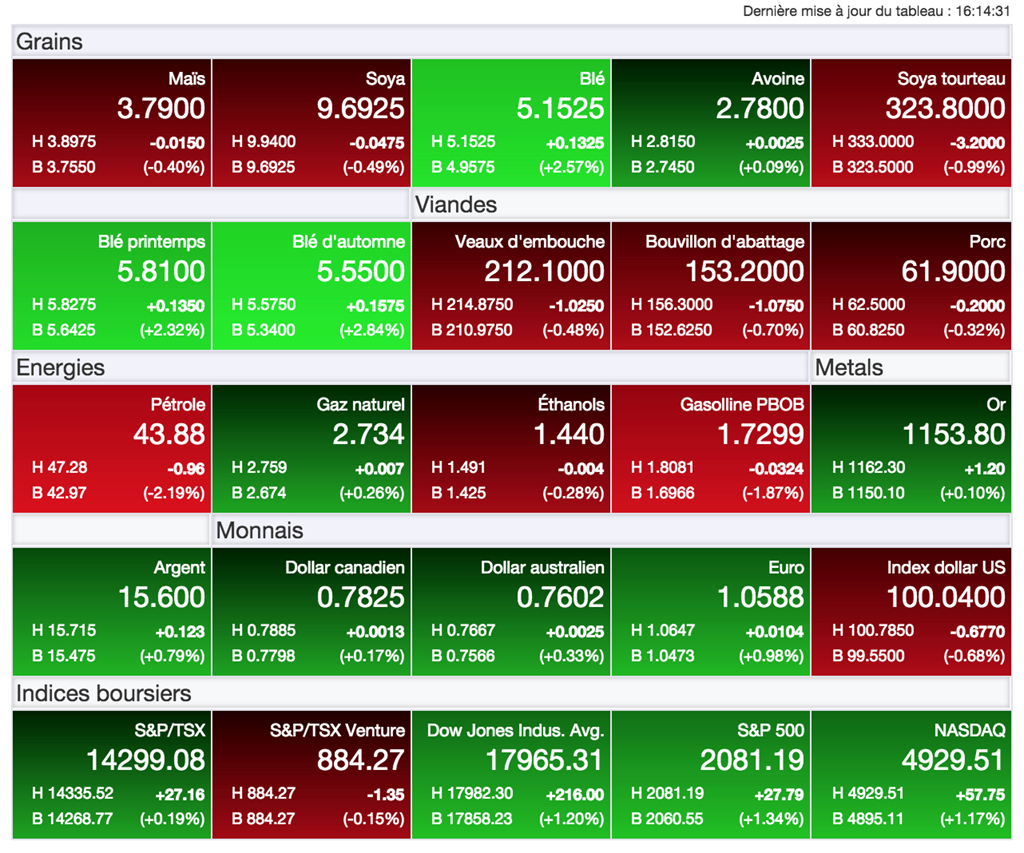 Pour un survol complet de la situation des marchés des grains et viandes (porc et bœuf) pour cette semaine, et de la tendance des prix, les abonnées à la lettre hebdomadaire de Grainwiz peuvent consulter la dernière édition : Lettre financière des marchés agricoles du 16 mars 2015