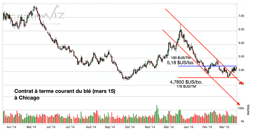 Pour sa part, le marché du blé à Chicago demeure à la hausse, mais fait maintenant face à une bonne résistance à l’approche de 5,20 $US/boisseau.