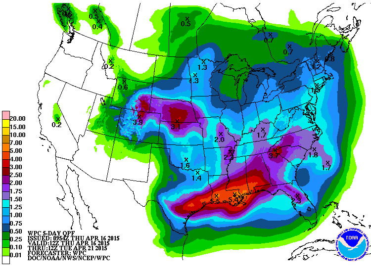Pour les prochains jours, ont s’attend encore à des averses, dans certains cas parfois même importantes, pour une bonne proportion des Plaines, du Midwest et du Delta.