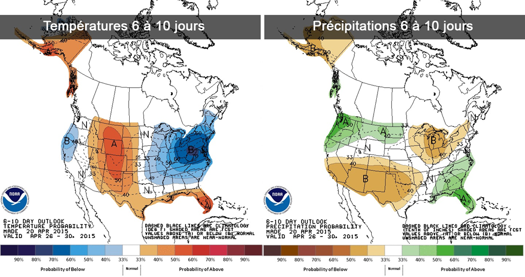 S’il y a retard dans les semis de maïs américain, ce n’est par contre pas le cas côté blé de printemps. Selon le rapport d’aujourd’hui, elles ont bondi de 17% au 12 avril dernier à 36% ce dimanche (19 avril). La moyenne des cinq dernières années est de 19%. Cette progression très rapide n’est pas surprenante et était à prévoir. En effet, dans les États plus au nord et à l’ouest du Midwest américain, les conditions observées sont très sèches depuis déjà plusieurs semaines, ce qui aura permis aux producteurs de prendre rapidement les devants pour débuter la saison.