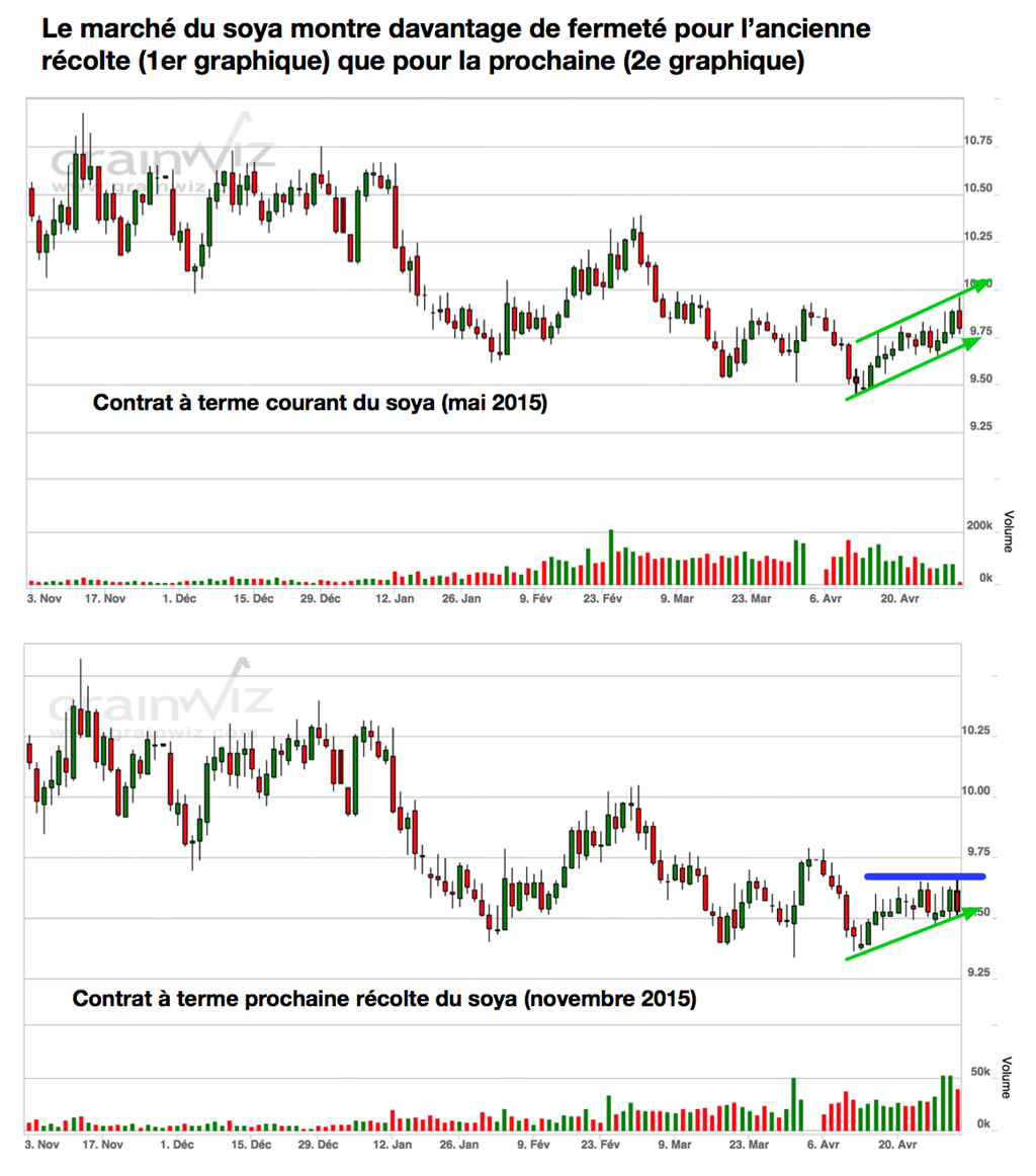 Côté blé, ce dernier continue de décevoir et rappeler aux exportateurs américains qui ne sont tout simplement pas à la hauteur de la forte compétition sur les marchés internationaux. La semaine dernière aura ainsi vu des ventes nettes à l’exportation négative de 445 000 tonnes, comme quoi avec plus que quelques semaines avant la fin de l’année commerciale 2014-15 aux États unis, il semble de plus en plus apparent que les exportations totales de blé américain ne soient pas à la hauteur des chiffres jusqu’ici prévus.