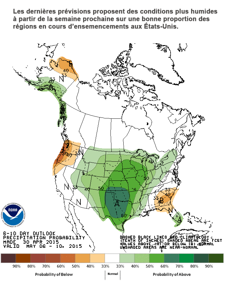 Les dernières prévisions proposent cependant davantage d’averses pour une bonne portion des Plaines, et du Midwest américains à partir de la semaine prochaine.