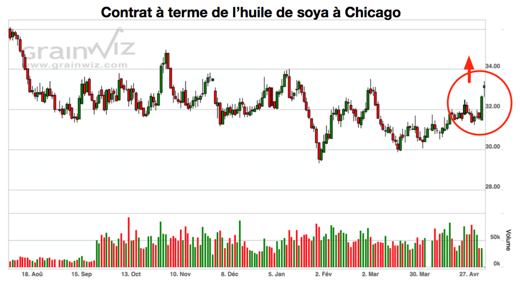 Dans le premier cas, une rumeur veut que la Chine soit actuellement à la recherche de quantité importante d’huile de soya. La réaction des marchés ne se sera pas fait attendre, avec une forte progression de sa valeur, entrainant ainsi dans son sillage celui du soya.
