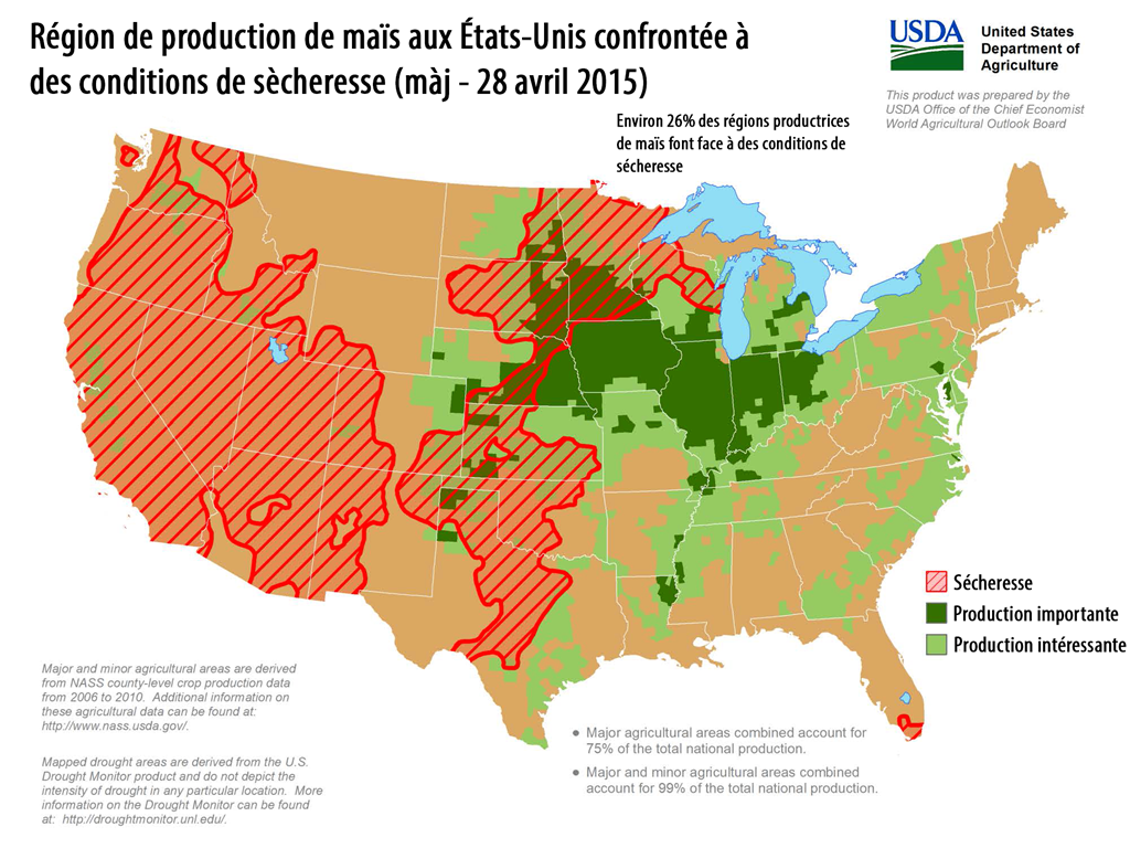 Pour les deux prochaines semaines, du temps plus sec et chaud que prévu est apparu sur le radar depuis hier. Ceci devrait permettre aux producteurs de très certainement compléter d’ici la mi-mai une bonne proportion de leurs ensemencements prévus. Il faudra cependant maintenant de bonnes averses pour permettre aux cultures de bien démarrer. Selon la dernière mise à jour sur les conditions de sècheresse observées aux États-Unis, certaines régions ne lèveraient certainement pas le nez sur un peu plus de précipitations.