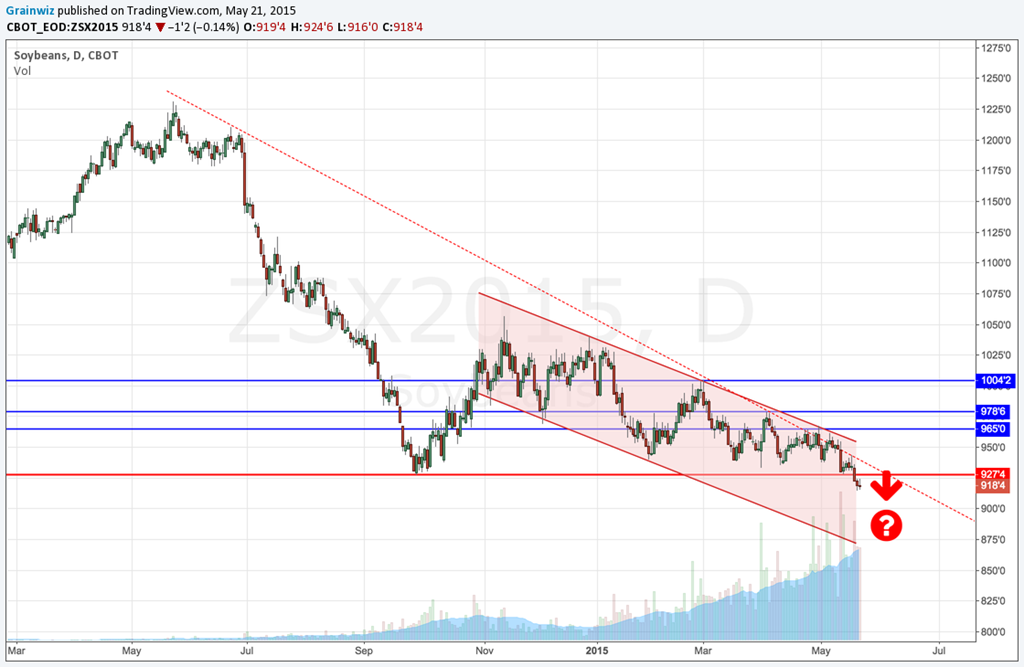 De fait, ces derniers ont atteint de nouveaux creux dans les derniers jours. Celui de l’ancienne récolte, le juillet 15, tente actuellement de trouver un support à son creux de l’automne dernier à 9,3725 $US/boisseau. Mais, de son côté, le contrat de la prochaine récolte (novembre 15) s’enfonce maintenant à de nouveaux creux inégalés après avoir brisé une dernière barrière à 9,2775 $US/boisseau.