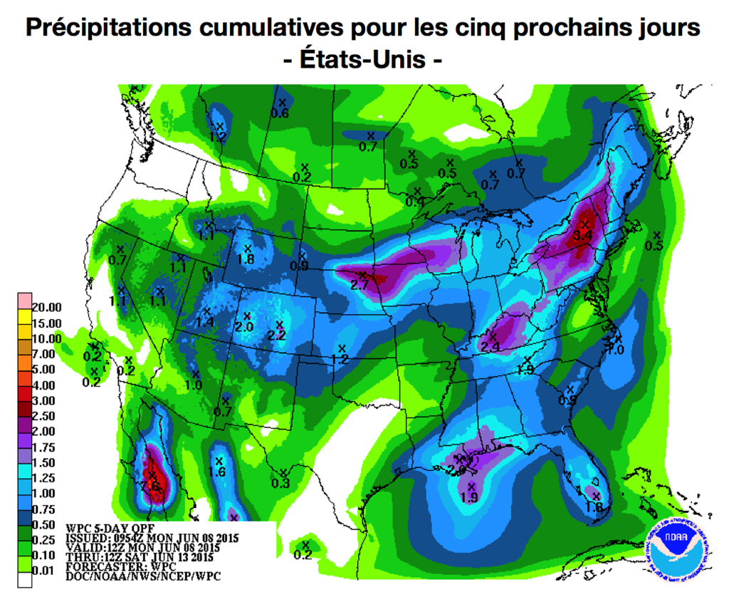 Les cultures de blé d’hiver ne sont pas en reste non plus. En effet, les conditions des cultures ont affiché un premier recul hebdomadaire de 1% dans la catégorie « bonne à excellente » qui passe à 43% dans la catégorie « bonne à excellente ». Avec les averses abondantes qui ont persisté la semaine dernière dans certaines régions du sud des Plaines amérianes, les récoltes de blé d’hiver affichent aussi un retard notable de 8% par rapport à la moyenne, en s’établissant à seulement 4%.