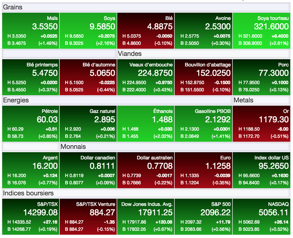 Dans les cas des marchés du maïs et du blé, le rebond aura été plus tempéré aujourd’hui, la tendance baissière à moyen terme étant toujours à l’œuvre dans les deux cas. Le marché du maïs tente de s’écarter de son nouveau creux inégalé depuis des mois sous 3,50 $US/boisseau (CàT juillet 2015), alors que celui du blé cherche par contre à confirmer/consolider sa position en vue d’un éventuel retour définitif à la hausse.