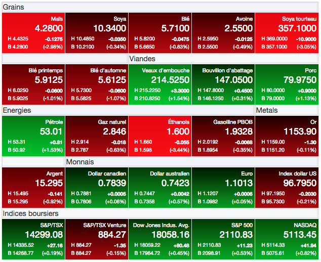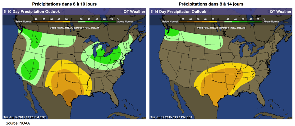 Techniquement, le marché du maïs est confronté à une bonne résistance autour de 4,40 $US/boisseau sur l’ancienne récolte (càt de septembre 15) et autour de 4,50 $US/boisseau pour la prochaine récolte (càt de décembre 2015). Dans le cas du soya, les résistances sont pour l’ancienne récolte autour de 10,55-10,65 $US/boisseau (càt de août 2015) et à 10,40 $US/boisseau pour la prochaine récolte (càt de novembre 2015).