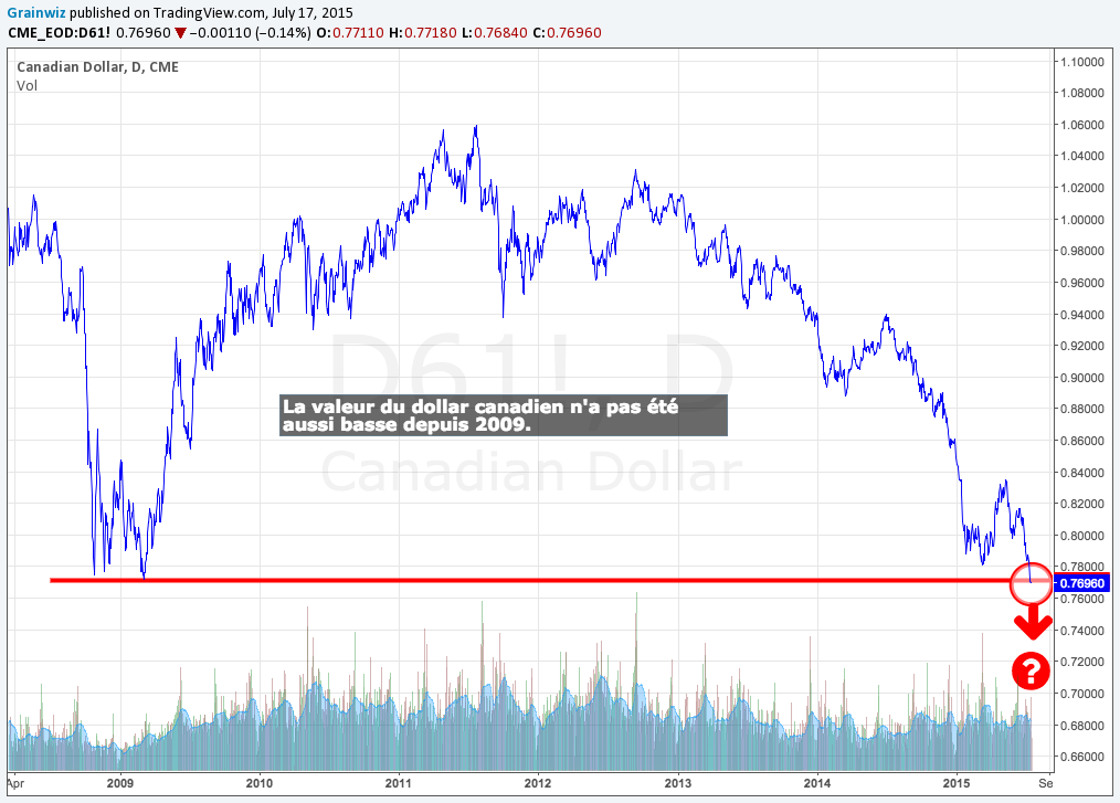 Mentionnons par contre que, au Québec, les producteurs de grandes cultures peuvent profiter plutôt de la faiblesse du dollar canadien qui vient d’amorcer une nouvelle chute de sa valeur, s’établissant présentement à son plus bas depuis 2009. Rappelons que généralement, un affaiblissement du dollar canadien contribue à raffermir la valeur de la base, et incidemment celle du prix proposé aux producteurs.