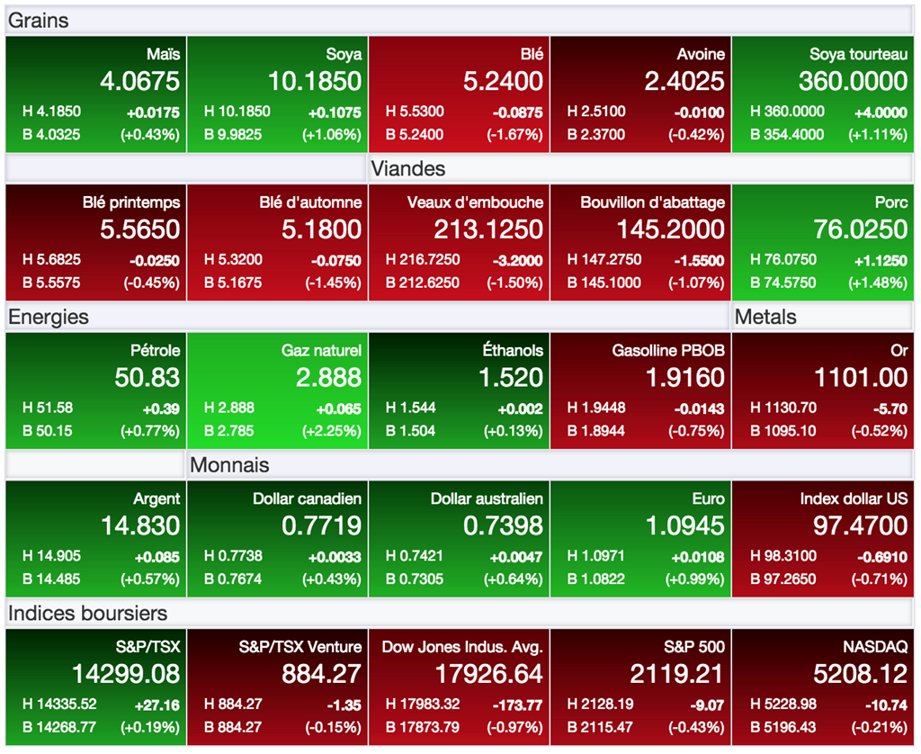 Journée mixte aujourd’hui suivant une dure journée pour amorcer la semaine hier. Le marché du soya semble ainsi reprendre un peu de pics, alors que celui du maïs cherche à se stabiliser, et que celui du blé plonge toujours.