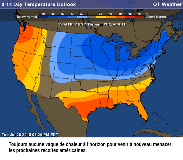 Dans l’ensemble, les conditions météo restent ainsi toujours favorables aux cultures aux États-Unis, alors que la valse des prévisions de rendements continue de faire son œuvre selon la perception qu’ont les différentes firmes d’analyse des dommages occasionnés par les précipitations abondantes de juin/début juillet dernier, et la perspective que les cultures américaines puissent prendre à nouveau du mieux dans les semaines à venir.