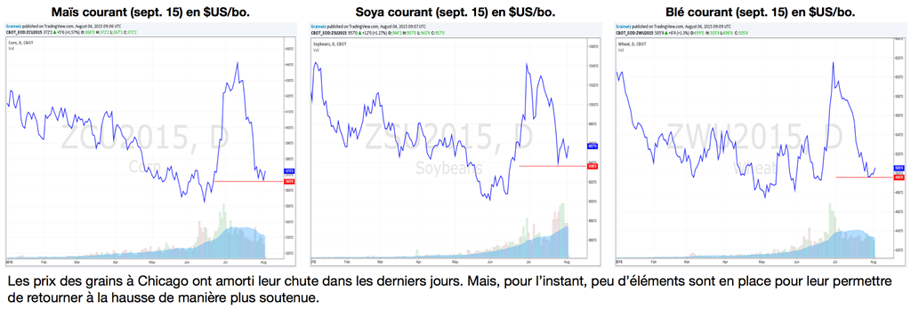 Techniquement, les prix des grains sont toujours en difficulté et très fragiles. Le recul important des dernières semaines les aura ramenés là où ils avaient amorcé leur rallye météo en juin. Ils profitent maintenant de bons supports sur lesquels ils se sont appuyés pour amortir leur chute (pour les abonnés, voir section analyse technique dans la dernière édition de la lettre hebdomadaire), reste à voir si ces derniers parviendront ou non dans les prochains jours à tenir le coup. Le cas échéance, il ne restera plus qu’une marge très mince avant que les creux de juin dernier ne soient revisités.