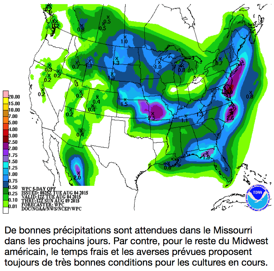 Seule ombre au tableau du côté consommation, la compétition reste forte sur l’échiquier mondial. Le Brésil a exporté 8,44 millions de tonnes de soya en juillet, comparativement à 6,04 millions de tonnes au cours du même mois l’an dernier. La Chine serait particulièrement active avec le Brésil, celle-ci profitant de la faiblesse du Réal brésilien et de la récolte record de cette année qu’il faut maintenant écouler.