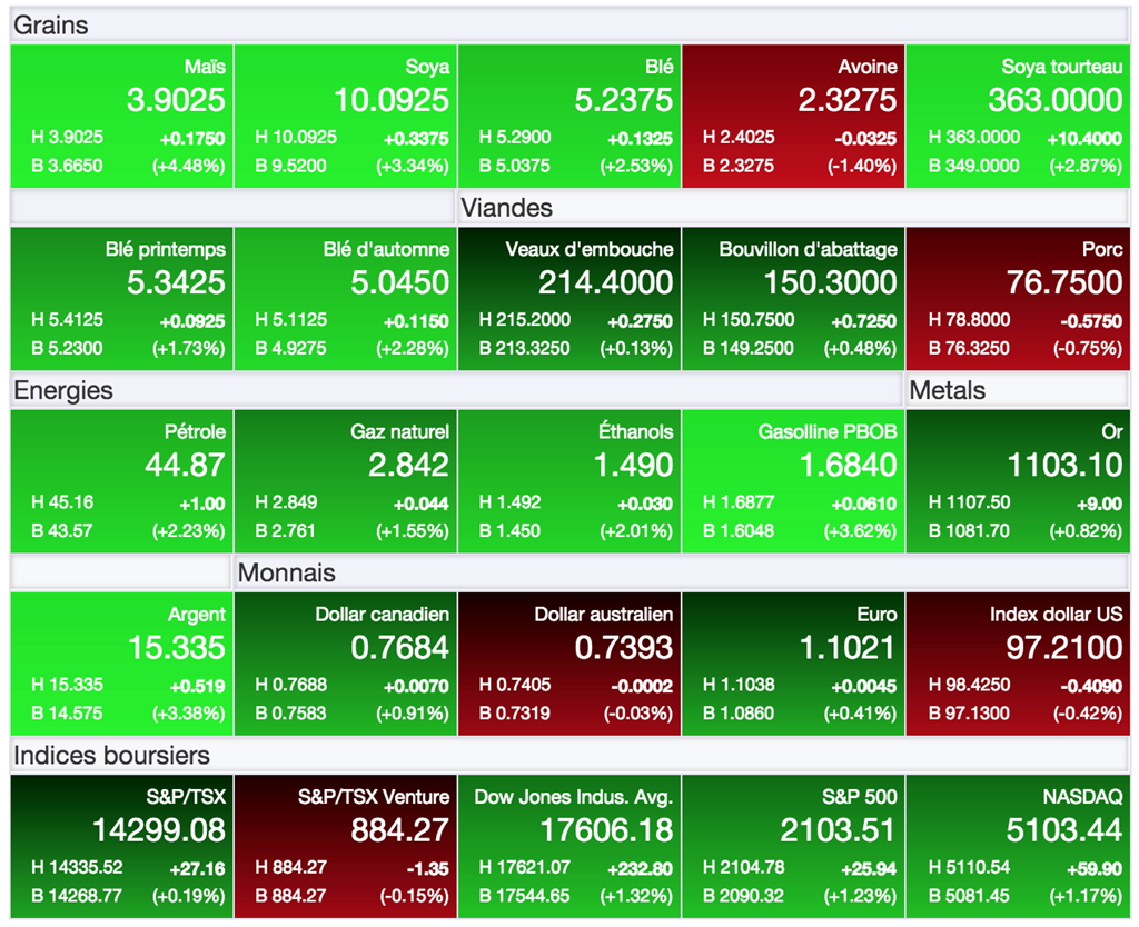 En fait, seul le blé fait bande à part avec une anticipation d’ajustement la hausse de la récolte américaine, et par conséquent, des inventaires pour 2015-16. Mais, les marchés ont relégué au second plan cette éventualité, préférant ainsi continuer de concentrer leur attention sur le raffermissement de la demande à l’exportation pour le blé américain, et les appels d’offres plus importants de la dernière semaine.