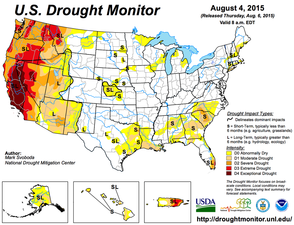À proprement parler, encore très peu de régions sont en état de sècheresse digne de mention, comme l’illustre la carte ci-haut. Par contre, les prochains jours (et semaines…) propose de temps plus sec, avec des cultures qui commencent à être sur la corde raide dans certaines portions du Midwest (nord de l’Illinois, Wisconsin, Minnesota) et le sud des Plaines américaines.