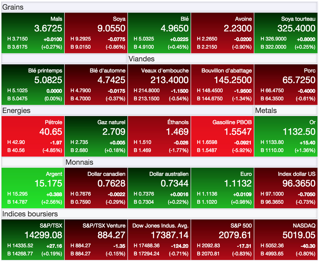 À l’opposé, le marché du soya continue de s’enfoncer sous la pression de meilleurs rendements à prévoir cet automne (récolte record?), celui-ci ayant passé sous le nouveau psychologique clé de 9,00 $US/boisseau à Chicago pour le contrat à terme de la nouvelle récolte (novembre 15), clôturant ainsi la journée à son plus bas depuis le printemps 2009, il y a plus de six ans.