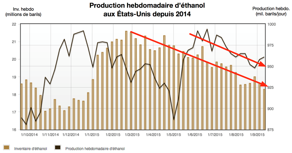L’EIA a présenté aussi mercredi des chiffres intéressants du côté de l’éthanol, avec une hausse hebdomadaire de la production américaine (+3 000 à 961 000 barils/jour) et un recul des stocks américains à leur plus bas depuis le début de 2015 (18,3 millions de barils); comme quoi la consommation du biocarburant reste toujours au rendez-vous.