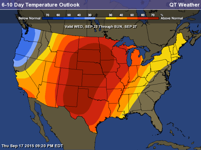 Côté météo, les prochains jours devraient voir de bonnes précipitations d’ouest en est de la portion centre du Midwest américain pour la prochaine fin de semaine. Par la suite, la prochaine semaine est cependant à nouveau plus sèche qu’à la normale, avec de bonnes conditions pour poursuivre les récoltes. Côté température, elles seront également plus fraîches pour les prochains jours dans certaines régions (Dakota du Sud, Nebraska, Iowa et Minnesota), mais les dernières prévisions proposent par contre encore des conditions plus chaudes qu’à la normale dans l’ensemble pour la prochaine semaine.