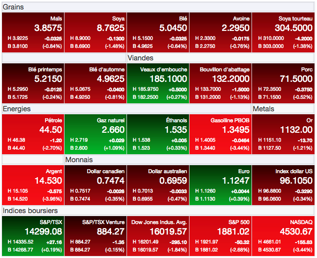 Techniquement, le recul des prix aujourd’hui laisse en place les tendances à court terme haussière qui ont pris forme dans les marchés du maïs et blé à Chicago. De son côté, le recul du marché du soya à Chicago renforce l’importance des résistances toujours en place à l’approche de 8,90-8,95 $US/boisseau (CàT octobre 15), avec une tendance neutre toujours effective, mais également une marge encore bien mince avec les creux atteints il n’y a pas si longtemps près de 8,50 $US/boisseau.