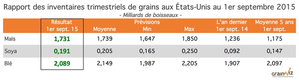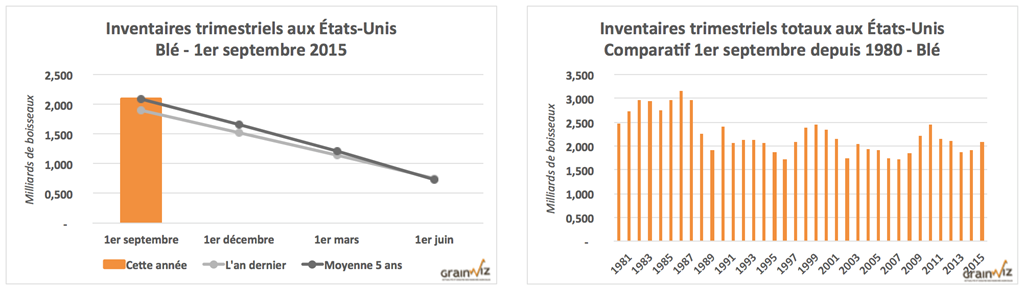 - Les stocks américains passent de 92 millions au 1er septembre 2014 à 191 millions de boisseaux cette année. C’est plus du double de l’an dernier. Par contre, les marchés prévoyaient en moyenne un résultat supérieur à 205 millions de boisseaux.