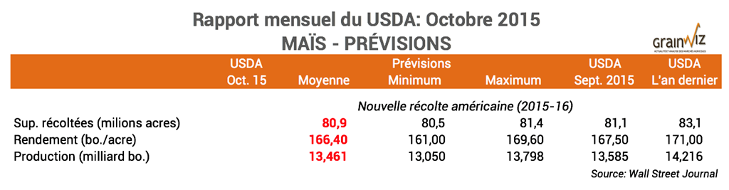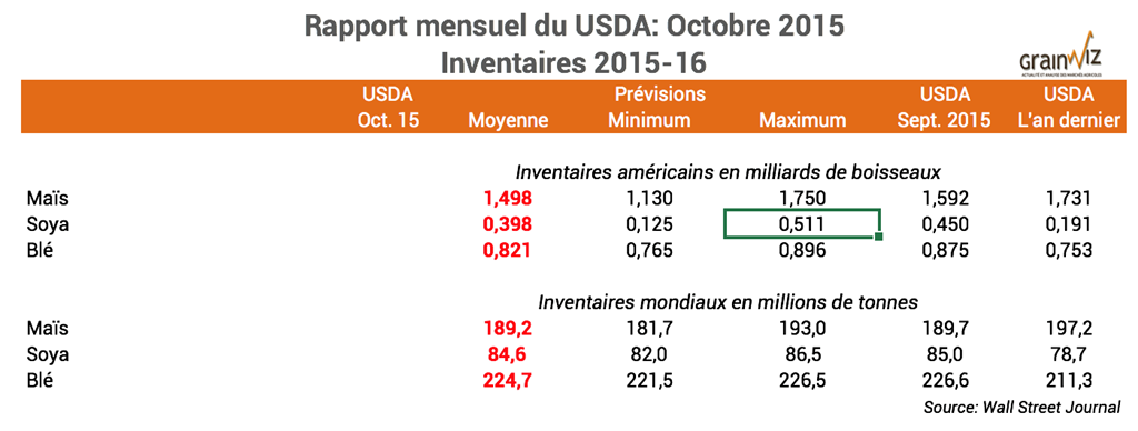 La nervosité des marchés est bien palpable moins de vingt-quatre heures avant la publication du prochain rapport mensuel d’offre et demande du USDA pour le mois d’octobre qui pourrait surprendre de nouveau les marchés. Après plusieurs jours, voire même semaines de progression intéressantes dans les cas des marchés du maïs et blé, les prix des grains ont tous clôturé en baisse aujourd’hui, les marchés se positionnant sur la défensive en prévision du rapport du USDA.