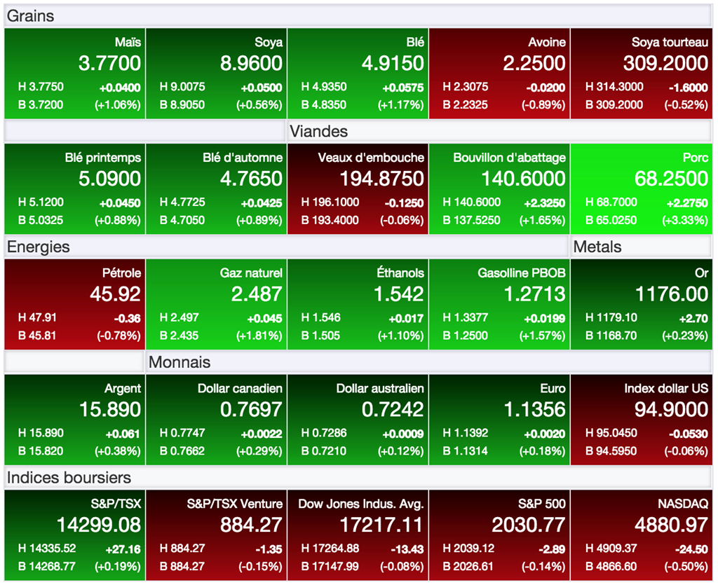 Les prix des grains ont repris un peu de tonus aujourd’hui suivant leur recul d’hier pour débuter la semaine. Il y a cependant peu de nouveau à se mettre sous la dent pour propulser ou écraser davantage les prix.