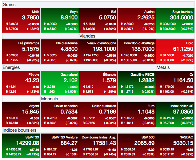 À surveiller demain, le rapport hebdomadaire sur la production et les stocks d’éthanol américain. Jeudi, le USDA présentera aussi son rapport hebdomadaire sur les exportations et ventes à l’exportation de grains. Il faut continuer de surveiller ces rapports puisqu’ils seront sans aucun doute l’un des 1ers signes (ou non) que la demande se renforcit sous l’effet des prix actuellement très faibles observés à Chicago.
