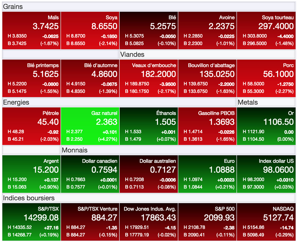 De son côté, le marché du maïs à Chicago est aussi en difficulté après avoir suggéré une timide fermeté prometteuse. Il a ainsi écarté aujourd’hui la tendance haussière qui avait pris forme depuis début septembre dernier. La question est à savoir maintenant s’il reculera davantage, où s’il adoptera plutôt une tendance neutre, ce que plusieurs analystes envisagent pour terminer 2015.