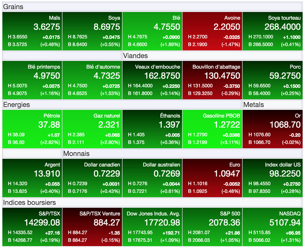 Blé : Les conditions de froid et le manque de neige dans certains producteurs aux États-Unis pourraient avoir causé certains problèmes aux jeunes pousses dans les différents états producteurs. Pour l’instant, les dommages sont difficiles à évaluer, mais les conditions se détériorent rapidement. De plus, certains états ont été sévèrement touchés par des situations climatiques extrêmes comme des tornades et des inondations dans le Midwest.