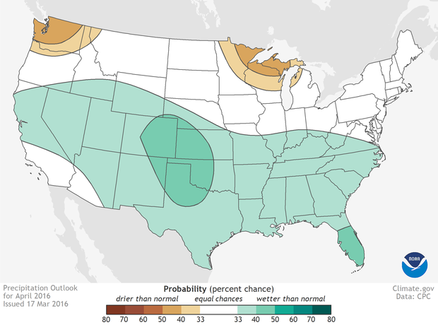 La semaine dernière, le NOAA a mis à jour ses prévisions pour le mois d’avril. Selon toute vraisemblance, il faut s’attendre à ce que du Texas jusqu’au Nebraska, et vers l’est jusqu’à la Caroline du Nord, les conditions restent anormalement humides.