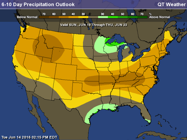 Sur un horizon de 6-10 jours, les conditions prévues demeurent anormalement sèches pour une bonne proportion des Plaines américaines et du Midwest à l’exception du nord/nord-est. Des températures anormalement chaudes et excessives sont toujours sur le radar également.