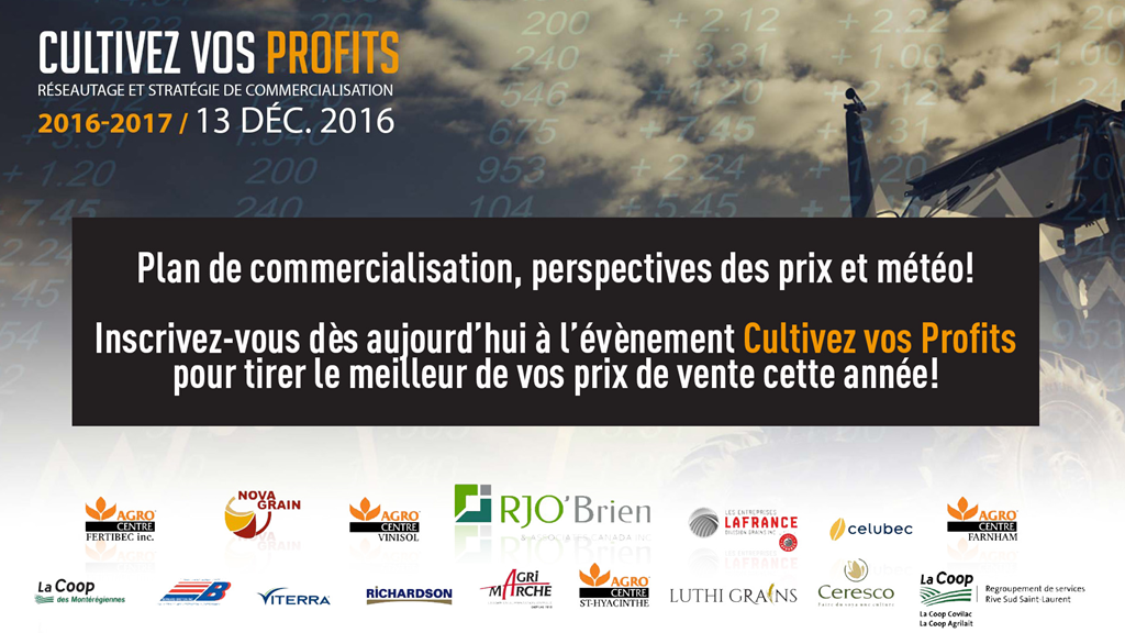 Techniquement, le rebond de début de semaine se veut très prometteur pour les prix des grains alors que la dernière semaine s’était terminée sur une note bien incertaine. Il faut cependant surveiller de près des résistances importantes dans les prochains jours afin de valider si ce retour à la hausse a le potentiel d’offrir davantage avant la période des Fêtes : le maïs à 3,60-3,65 $US/boisseau (CàT Mars 17), le soya à 10,65 $US/boisseau (CàT Janv 17) et le blé à Chicago autour de 4,09-4,11 $US/boisseau (CàT Mars 17).