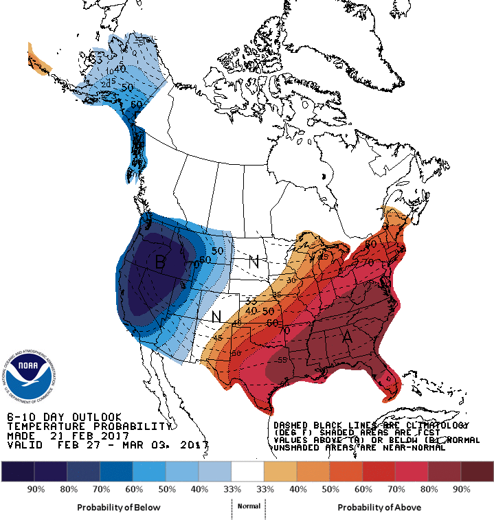 Aux États-Unis, le redoux de la dernière semaine se poursuit avec des températures qui resteront encore plus chaudes qu’à la normale pour les 6-10/8-14 prochains jours selon le NOAA. On craint toujours que les cultures de blé d’hiver ne sortent trop rapidement de leur dormance dans les Plaines américaines, s’exposant ainsi à des températures éventuellement trop froides par la suite.