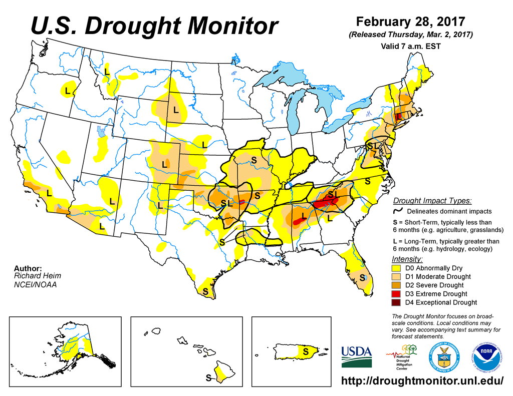 Dans les Plaines américaines, les conditions des cultures demeurent une source de préoccupation des marchés, les producteurs américains ayant déjà semé leurs plus faibles superficies en blé d’hiver depuis 1909. Selon le dernier relevé sur les conditions de sècheresse, celles-ci gagnent du terrain. Les dernières prévisions météo proposent peu de précipitations à l’horizon, que ce soit pour les deux prochaines semaines comme l’ensemble du mois de mars.