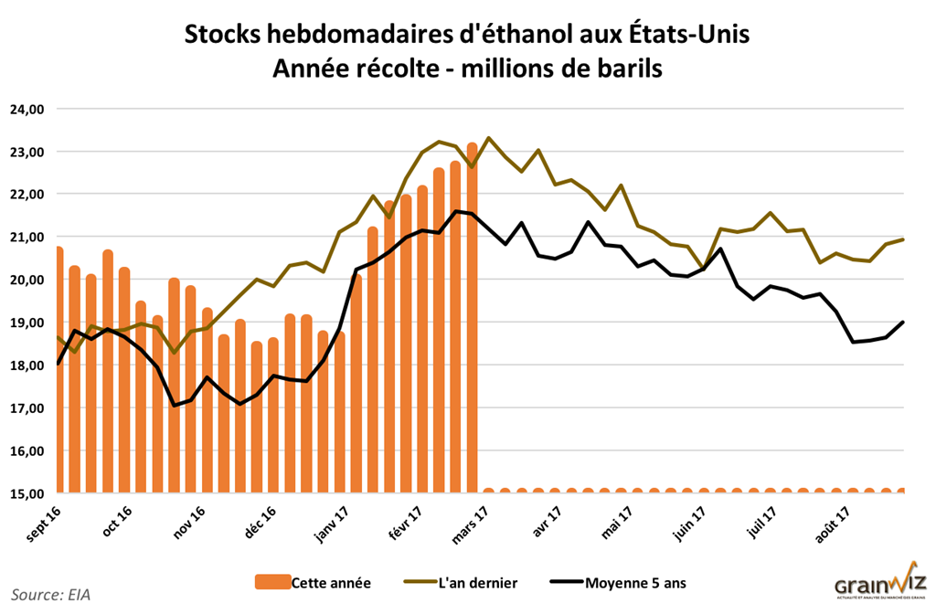 Mercredi, le rapport hebdomadaire de l’EIA a proposé une production inchangée à 1,034 millions de barils/jour. Ce niveau reste élevé par comparaison des dernières années et intéressant. Par contre, les stocks s’accumulent dangereusement, en hausse pour une 8e semaine consécutive à 23,091 millions de barils, plus que les niveaux enregistrés à pareille date l’an dernier et en moyenne depuis 5 ans, et très près du record de l’an dernier de 23,307 millions de barils. Par contre, il est d’usage d’observer à cette période-ci une hausse des stocks d’éthanol et, selon la tendance des dernières années, ils devraient maintenant progressivement reculer.