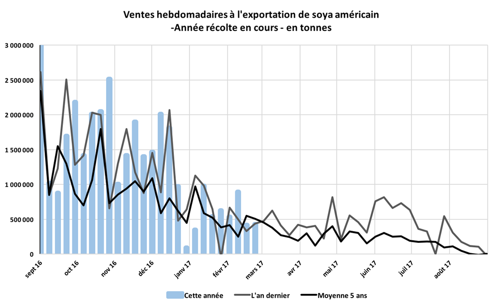 Le rythme des ventes américaines à l’exportation de soya demeure néanmoins au-dessus de celui nécessaire pour atteindre la prévision d’exportations 2016-17 de soya du USDA d’ici la fin août qui est maintenant de 99 000 tonnes/semaine.