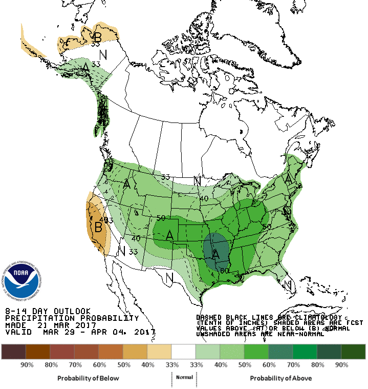 De bonnes averses sont attendues dans les deux prochaines semaines. Ceci pourrait ralentir le début des travaux aux champs, mais permettra aussi d’assurer dans pratiquement l’ensemble du Midwest et des Plaines américaines de bonnes réserves d’eau pour aider les cultures à démarrer la saison. Les prévisions actuelles moyen terme pour le mois d’avril et la période avril/mai/juin suggèrent des températures qui resteront plus chaudes qu’à la normale. Ces réserves d’eau de début de saison ne seront donc pas de trop. Plus au nord, certains analystes signalent cependant des risques d’inondations qu’il faudra garder à l’œil.