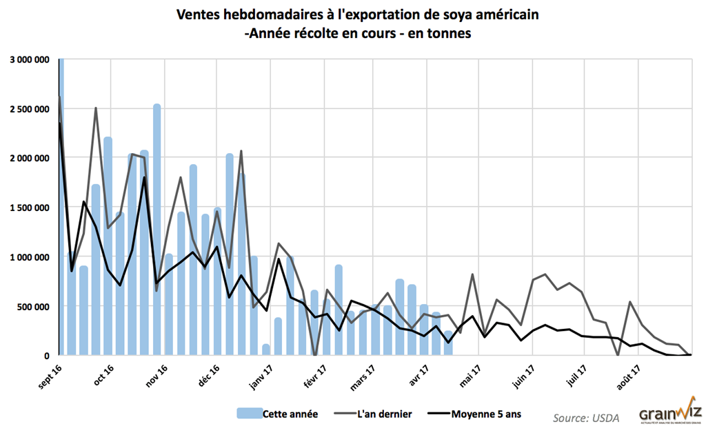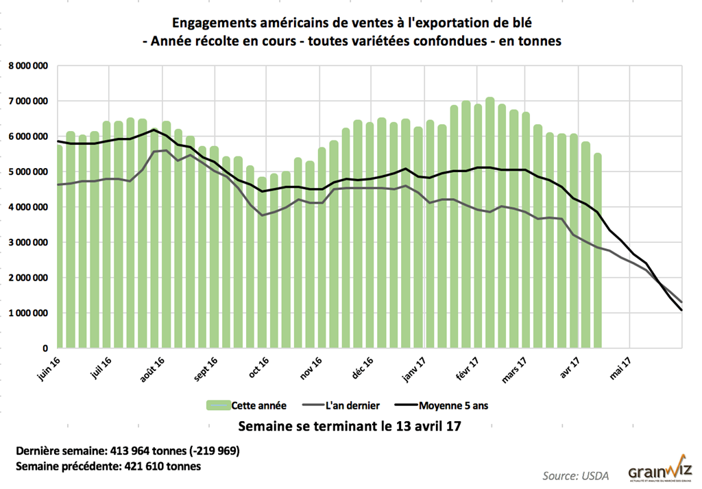 Blé – Les ventes de blé américain ont été de 414 000 tonnes, dans les attentes les plus élevées des marchés (250 000 à 450 000 tonnes). Il ne reste plus que quelques semaines avant la fin de l’année commerciale 2016-17 (31 mai). Au cumulatif, les ventes ont déjà atteint 98% de la prévision d’exportations de blé 2016-17 du USDA. Par contre, les engagements à l’exportation restent élevés à 5,4 millions de tonnes alors qu’ils sont en moyenne de 3,8 millions de tonnes pour cette période-ci depuis 5 ans.