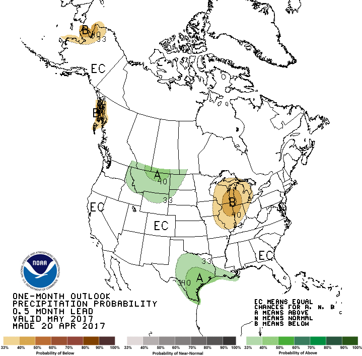 Le NOAA a aussi mis à jour aujourd’hui sa prévision mensuelle météo pour mai aux États-Unis qui suggère un retour à des conditions dans la normale à beaucoup plus sèches. C’est dire que les producteurs américains devraient profiter encore de bonnes opportunités en mai pour terminer leurs ensemencements de maïs dans les temps et faire progresser ceux de soya. Généralement, les ensemencements de maïs sont complétés autour de la 3e ou 4e semaine de mai.