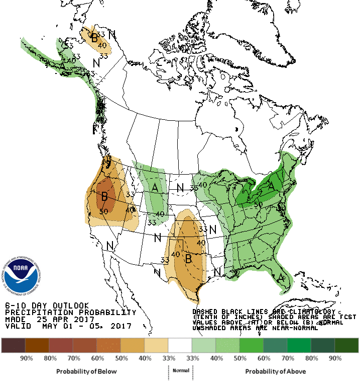 Côté météo américaine, les dernières prévisions proposent encore des conditions humides cette semaine et pour débuter le mois de mai. Les températures seront également plus froides qu’à la normale; certaines régions du Midwest étant même à risque de précipitations de neige. On note cependant que les prévisions penchent tranquillement vers des conditions plus sèches depuis quelques jours sur un horizon 6-10 et 8-14 jours.