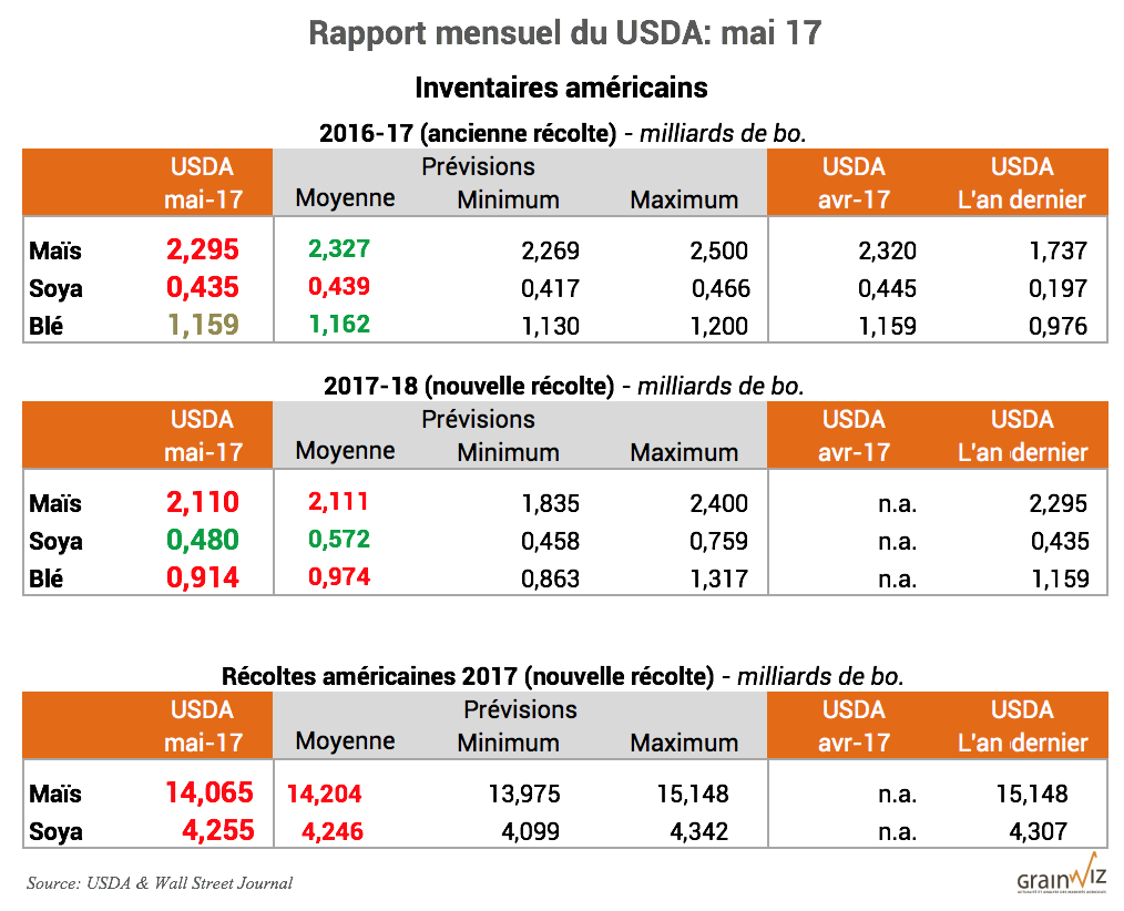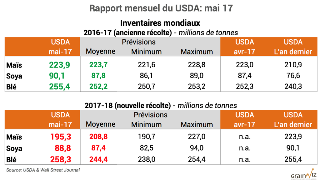 Le USDA a publié ce midi son rapport mensuel pour le mois de mai 17. Voici un bref aperçu des résultats de ce rapport.