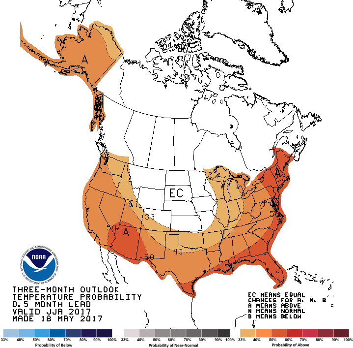 Un coup d’œil permet de relever rapidement un passage progressif à des températures anormalement chaudes pour la saison estivale. Bien qu’il soit aventureux d’en tirer toute conclusion prématurée, il apparaît maintenant possible que les cultures américaines ne soient donc pas au bout de leur peine cet été, avec un risque accru de conditions trop chaudes pour la pollinisation (maïs en juillet) et le remplissage des gousses (soya en août).