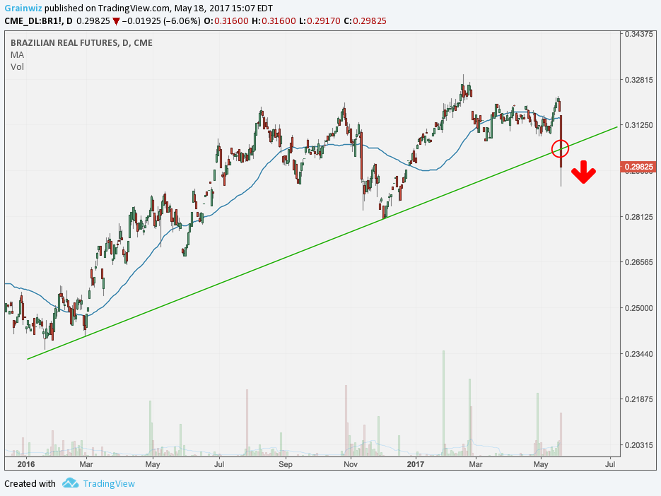 Très mauvaise journée pour le marché des grains qui aura dû composer avec les déboires du président Brésilien, M. Michel Temer, entourant une allégation de pot-de-vin avec le président du distributeur de viande JBS au Brésil, M. Joesley Batista. Ébranlé par cette annonce, le Réal brésilien a brusquement reculé de plus de 8%.