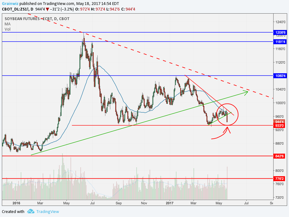 Techniquement, difficile de relever quoi que ce soit de positif du cuisant revers du prix du soya à Chicago aujourd'hui. Le début de tendance court terme qui cherchait a prendre forme a été écarté du revers de la main, laissant maintenant un support important à surveiller à 9,40 $US/boisseau (CàT Juillet 17). S’il est brisé, il faudra alors garder à l’œil le creux récolte à 9,33 $US/boisseau.