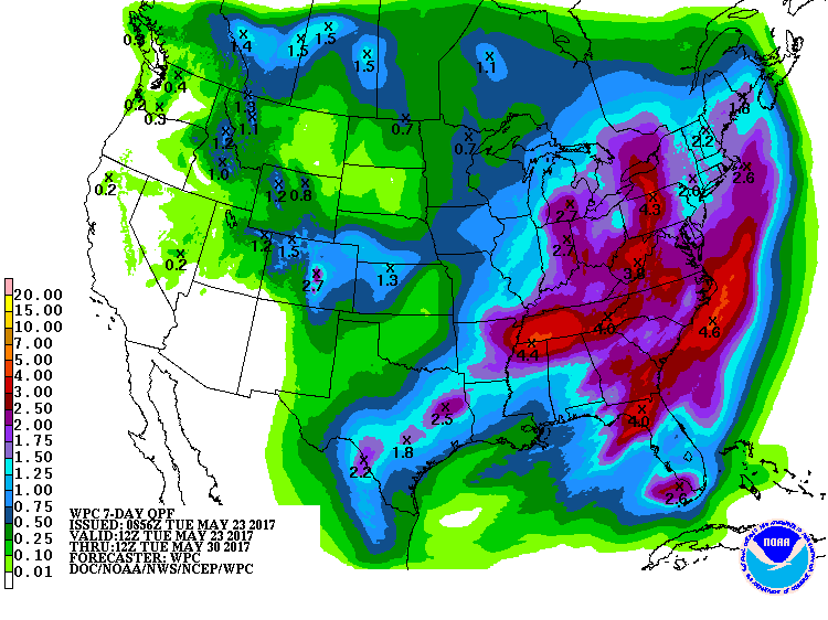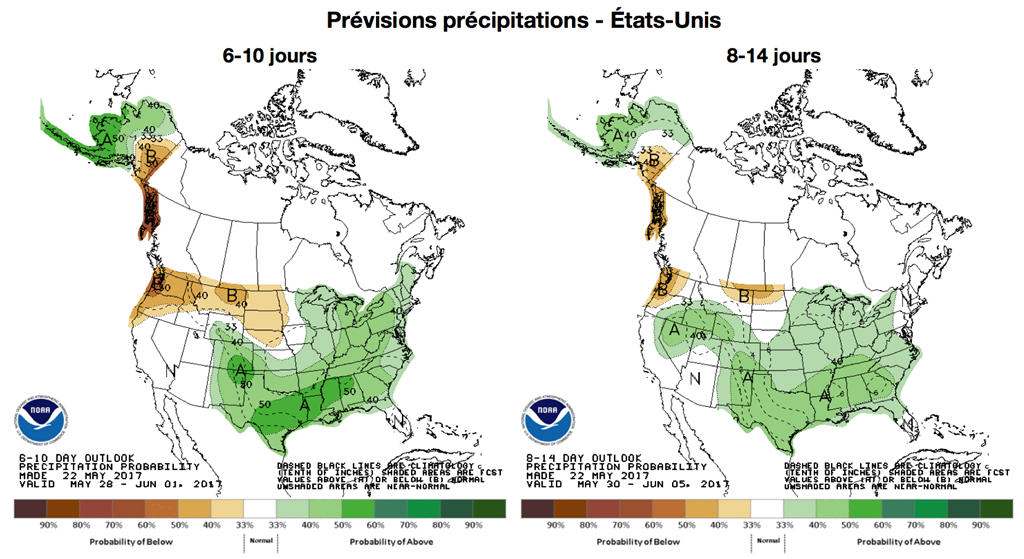 Et, de toute évidence, les producteurs américains devront encore composer avec des conditions très humides pour au moins deux semaines selon les dernières prévisions du NOAA 6-10 et 8-14 jours. Il ne fait aucun doute que certaines superficies devront être semées de nouveau.