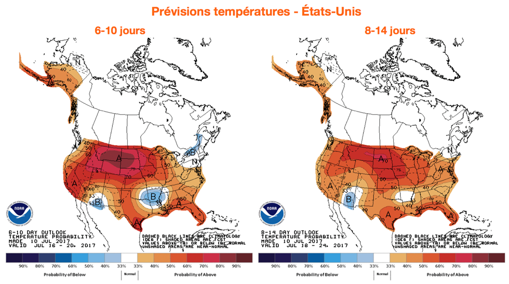 De leur côté, les dernières prévisions météo demeurent encore très chaudes et sèches pour une bonne proportion de l’ouest et du nord-ouest du Midwest et des Plaines américaines pour les 6-10 et 8-14 prochains jours. L’équipe de Worldweather note cependant que ces conditions pourraient être un peu plus « passagères » que prévu.