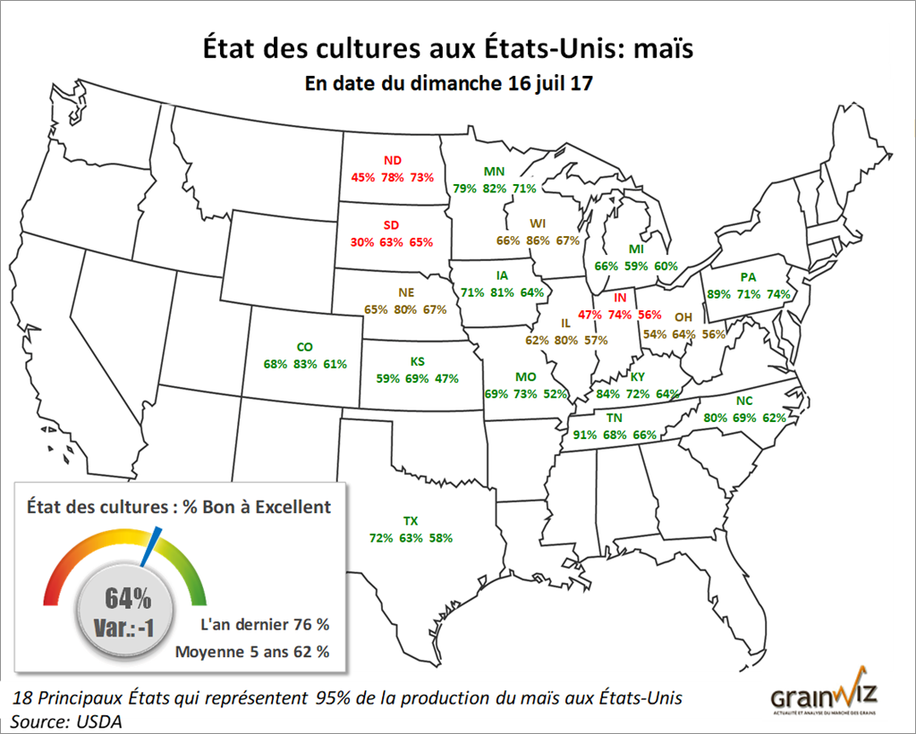 Les marchés anticipaient hier un recul de l’état des cultures américaines. Néanmoins, ceux-ci s’interrogent sur la suite des choses puisque les cultures sont maintenant à des stades importants de leur développement.
