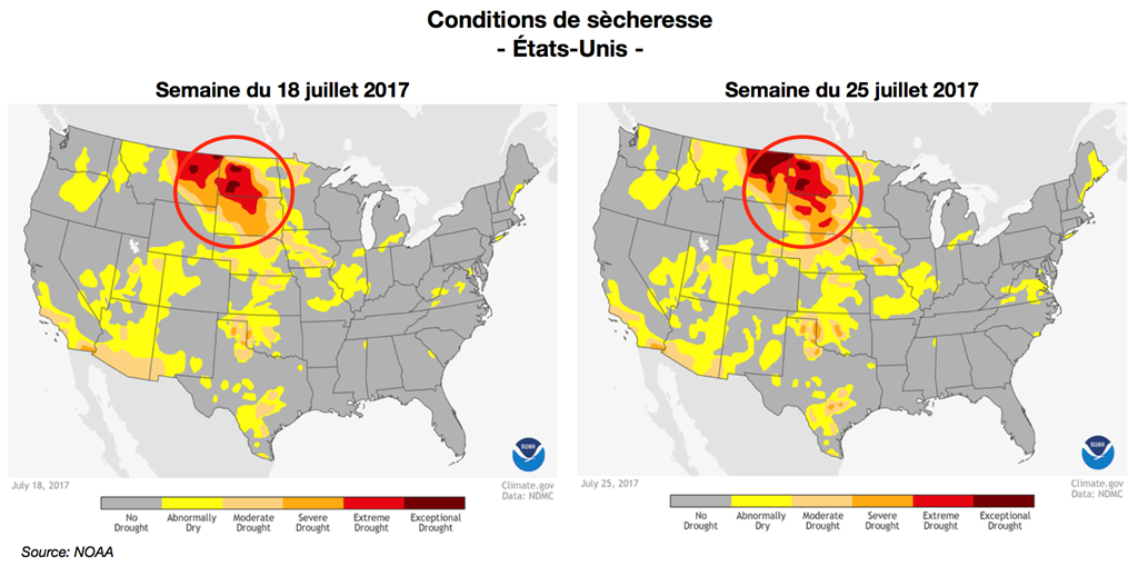 Mais, la météo peut encore et toujours surprendre avec un retour de conditions trop chaudes et sèches. Avec les excellents chiffres d’exportation de soya américain qui se poursuive, les marchés pourraient donc se montrer de nouveau très réactifs face à des conditions météo adverses en août. Rappelons que la marge de manœuvre est déjà moindre pour la récolte de soya que celle de maïs. Bien que les stocks américains de cette année soient importants, un recul du rendement moyen à 46,5 bo./acre (actuellement le USDA se situe à 48 bo./acre) porterait les stocks de fin 2017-18 à 290 millions de boisseaux, un niveau nettement plus serré que les 460 millions de boisseaux actuellement prévus.